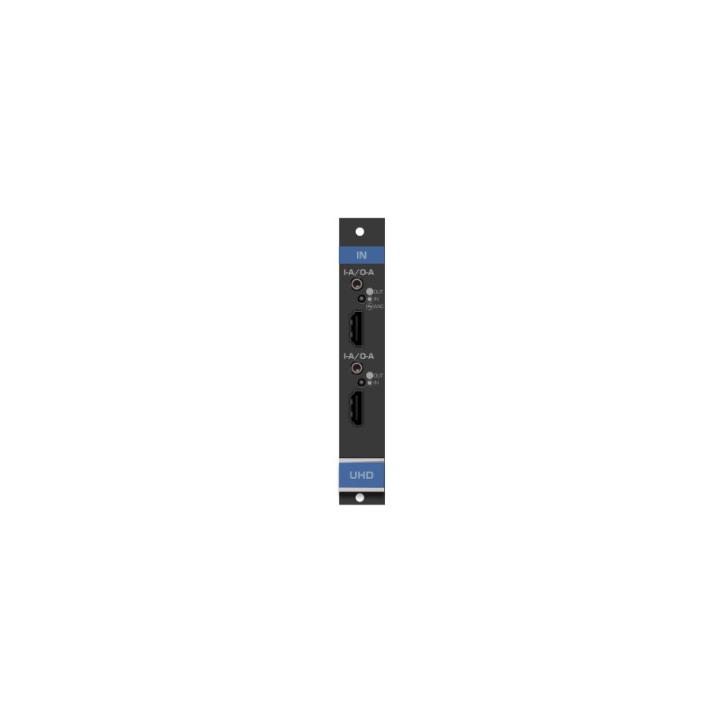 UHDA−IN2−F16 is a two−channel 4K@60Hz (4:2:0) HDMI input card with configurable analog audio features for the VS−1616 Series Modular Multi−Format Digital Matrix Switchers. The UHDA−IN2−F16 inputs two 4K HDMI signals with selectable ARC (on the upper port), embedded, or de−embedded unbalanced stereo audio.