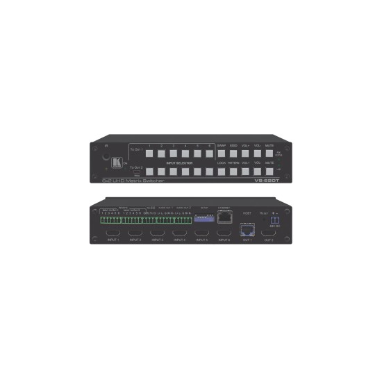 VS−62DT is a 6x2 4K@60Hz (4:2:0) HDMI/HDBaseT matrix switcher with HDMI and HDBaseT output transmitters that provide long−reach video and audio transmission. It supports resolutions of up to 4K@60Hz (4:2:0) and WUXGA. The matrix is a PoE provider that provides power over Ethernet to compatible PoE receivers.